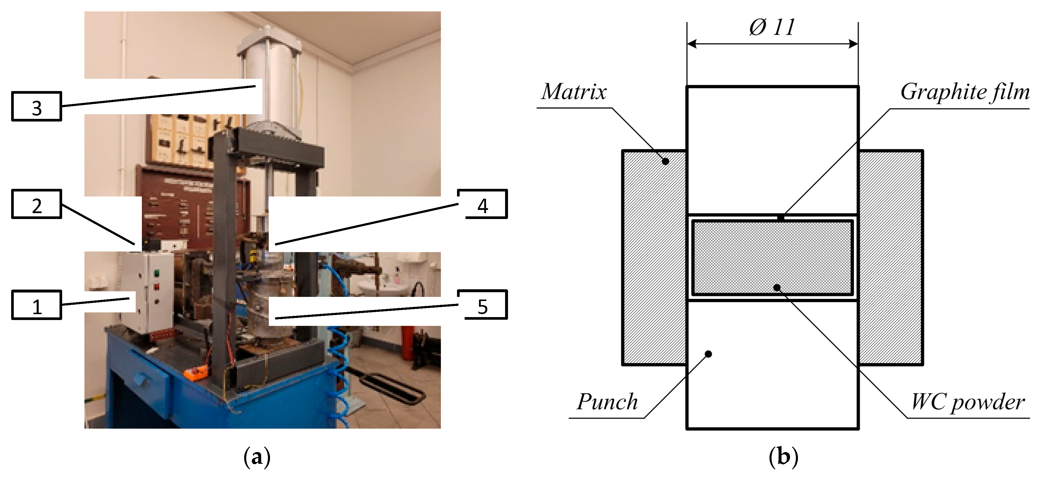 Figure 2a, with the main components denoted as follows: (1) power block, (2) current and temperature control unit, (3) pneumatic actuator for uniaxial pressure, (4) built-in graphite mold, (5) vacuum chamber. The vacuum chamber had a volume of 7 dm