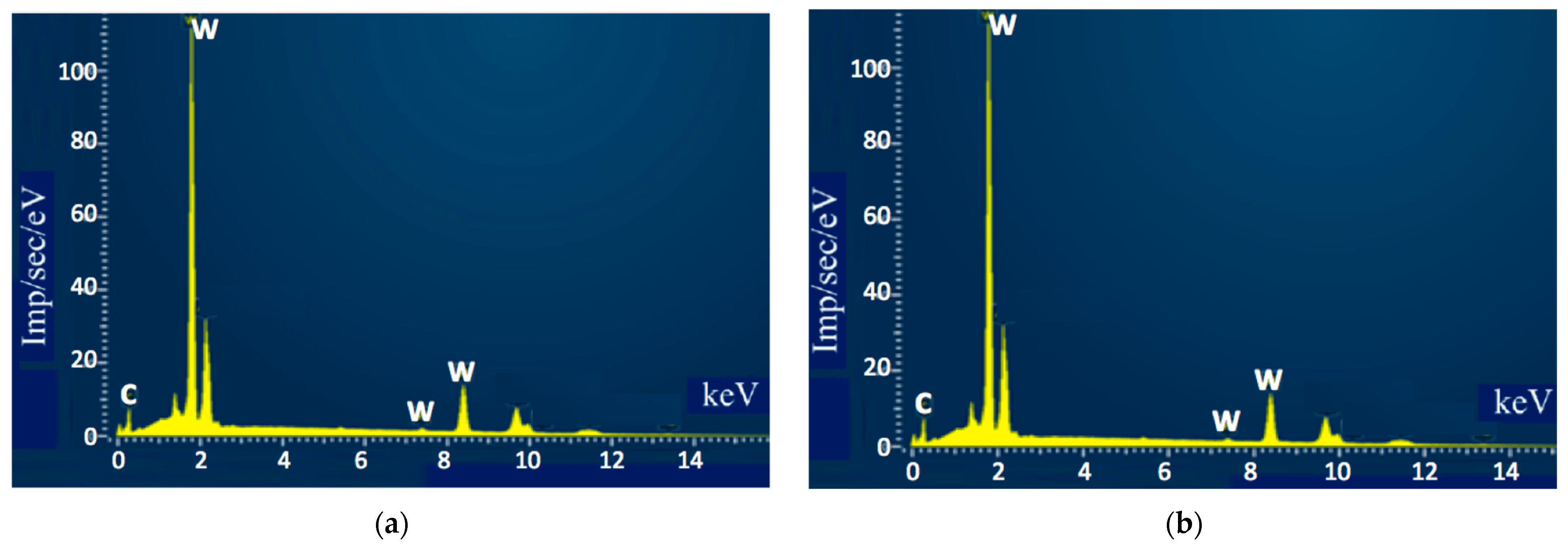 2C appeared, together with respective amounts of free carbon. Thus, the reaction described by Equation (3) took place at elevated temperatures and could not be avoided even with high heating rates. The appearance of small amounts of W