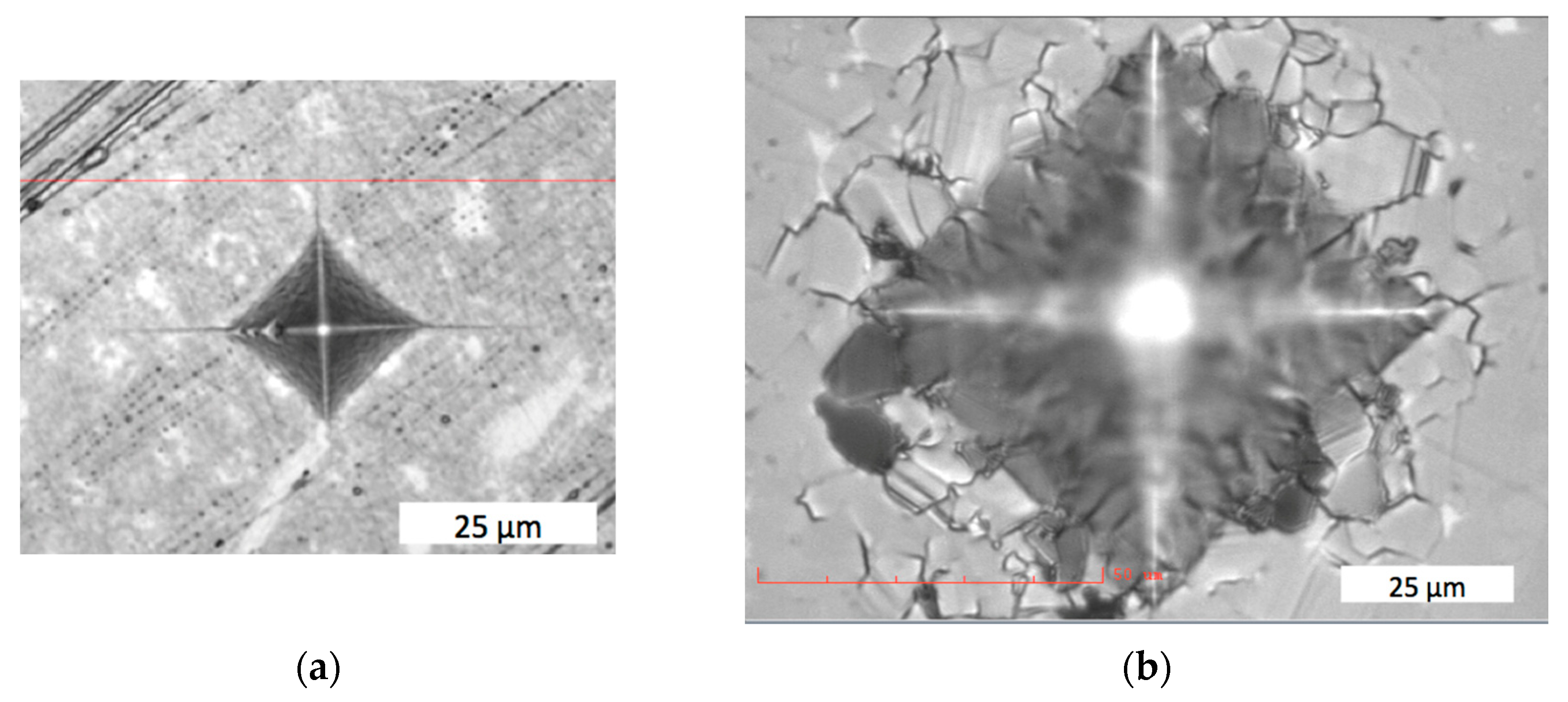 After an indenter was applied to the binderless μWC material, cracks appeared at the corners of the imprint and were almost linear, directed outwards from the center, as shown in