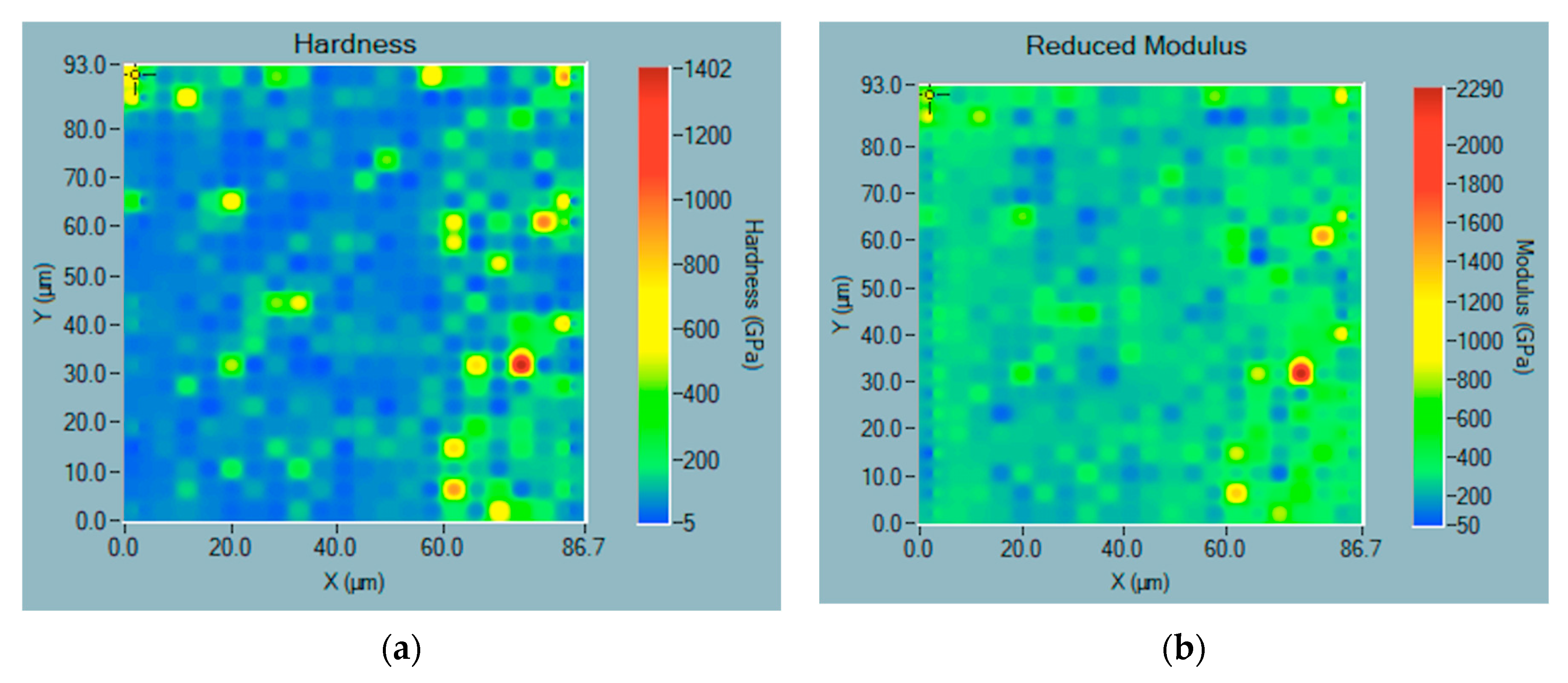 Nanoindentation mapping allowed for assessment of the hardness and modulus distribution across the material surface. An example of an obtained map for μWC sintered at