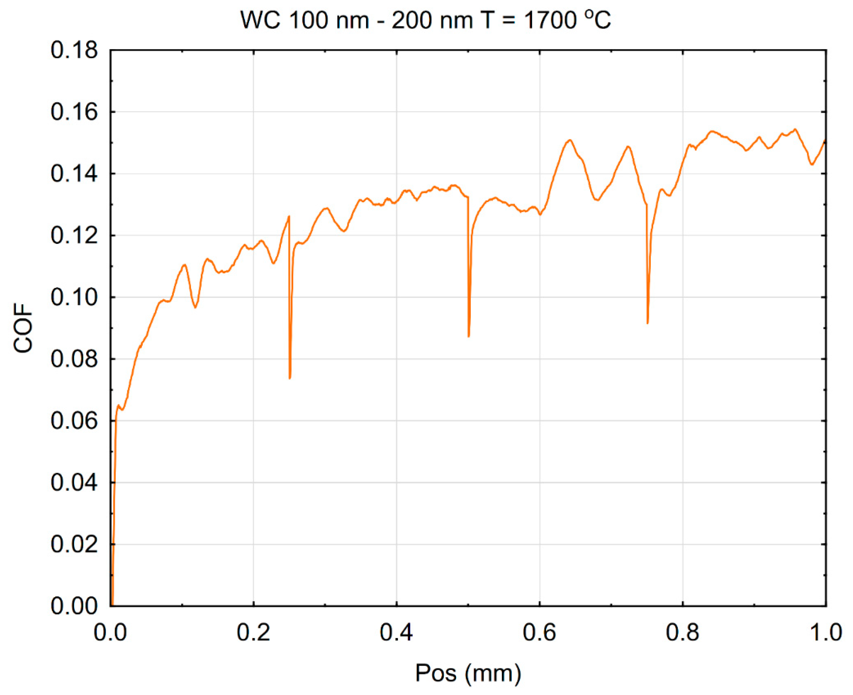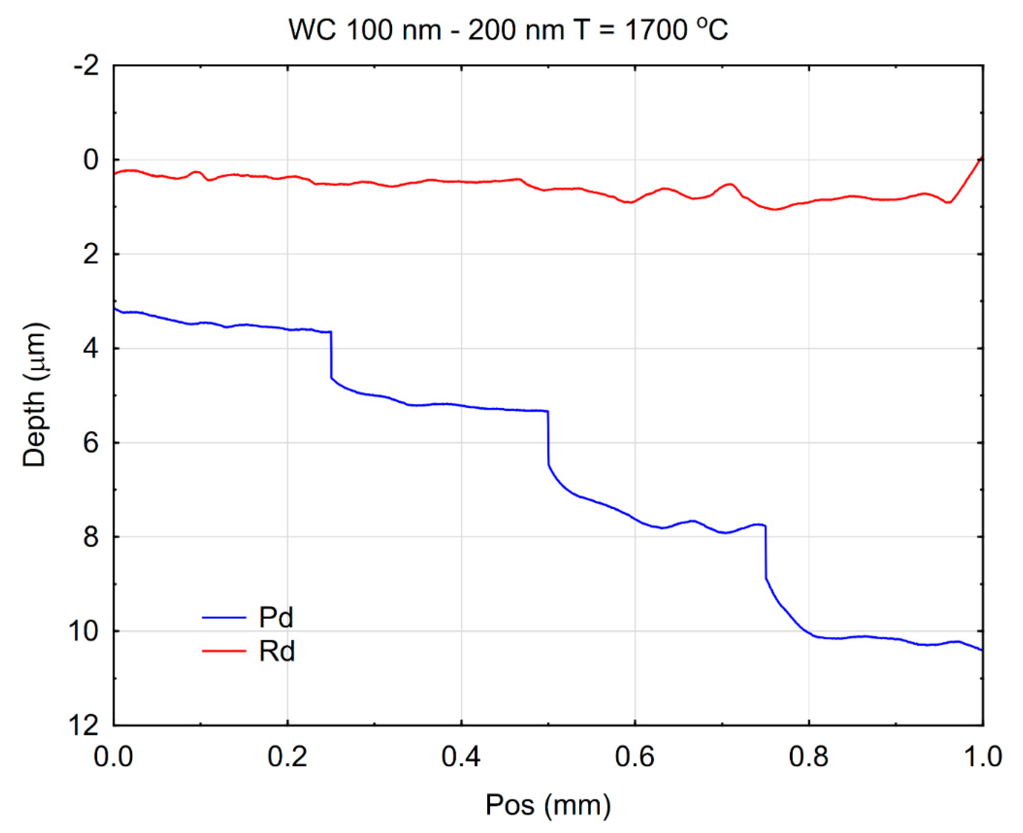 Figure 12. This result may indicate a significant contribution from elastic load, influencing the course of the Pd curve. This suggests that under relatively low loading conditions, the μWC surface offered less resistance to indentation-induced deformation. The phenomenon may be attributed to microstructural factors, such as grain boundary characteristics, porosity, or surface roughness, which can influence the initial material response. The enhanced performance under elevated loads can be explained by the intrinsic properties of tungsten carbide—namely, its extremely high hardness, strong covalent bonding, and resistance to plastic flow and fracture under compressive stress. The transition in scratch resistance behavior with increasing load reflects the complex mechanical response of WC-based materials. While more prone to surface indentation, they benefit from high structural rigidity and fracture toughness at elevated stresses, which likely leads to reduced progression of the scratch depth. Such results are particularly relevant for applications where materials are exposed to variable mechanical loads, such as in cutting tools, wear-resistant coatings, and high-stress tribological systems.