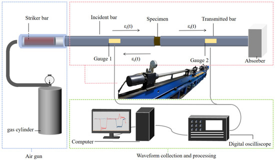 The SHPB system is currently the most representative and relatively accurate test device for studying the impact mechanical characteristics of brittle materials [35]. In this paper, a Φ50 mm SHPB device (WAW3000A, Hengle Xingke Instruments, Jinan, China) (as shown in Figure 2) was used in the Explosion and Impact Protection Laboratory of Chang‘an University to carry out impact compression tests on BFRC specimens with different volume content and different temperature conditions. The impact rates were set as 5.4 m/s, 8.8 m/s, and 11.3 m/s, respectively, and the “two-wave method” was used to calculate the stress [36]. Upon acquiring the raw data, waveform distortions and datasets failing to reach pressure equilibrium were excluded. Only data with reliable waveforms and stresses closest to complete equilibrium were retained as the subject of study to ensure the validity of the results [37,38].
