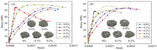 Taking the impact rate of 8.8 m/s as an example, the stress–strain curves of BFRC under different fiber content conditions are shown in Figure 3. In order to further reveal the working mechanism of basalt fiber and its influence on the mechanical properties of the sample under impact compression, Electron microscope scanner (Quanta 650, FEI Company, Hillsboro, OR, USA) was used to carry out electron microscopy tests, and the microscopic morphology of BFRC with different fiber content was obtained, as shown in Figure 4.