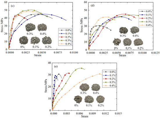 Figure 3. Stress–strain curves of BFRC with different fiber content: (a) 20 °C; (b) 200 °C; (c) 400 °C; (d) 600 °C; (e) 800 °C.