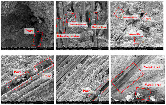 Figure 4. SEM microscopic topography of specimens with different fiber content: (a) 0%; (b) 0.1%, (c) 0.2%; (d) 0.3%; (e) 0.4%; (f) weak area.