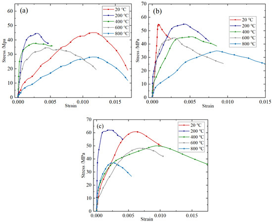 Taking the working condition of 0.2% fiber content as an example, the stress–strain curves of the BFRC specimens under different temperature conditions are shown in Figure 5.