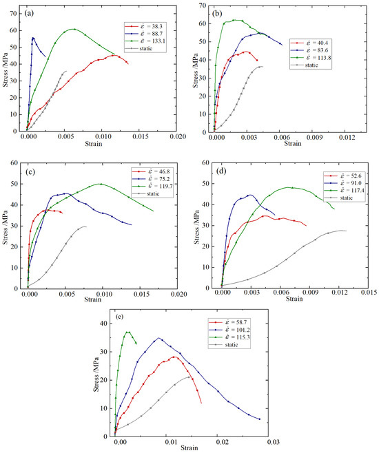 Figure 6. Stress–strain curves at different impact rates: (a) 20 °C; (b) 200 °C; (c) 400 °C; (d) 600 °C; (e) 800 °C.