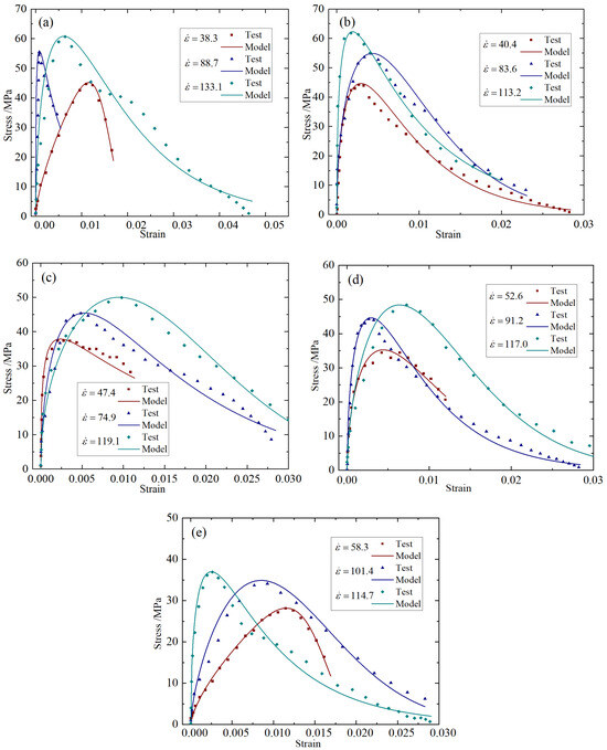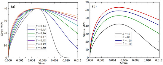 Figure 8a illustrates the influence law of parameter β on the curve shape. Under the conditions of ξ = 100 and ε ˙ = 80, when β increases from 0.44 to 0.50, the peak stress remains the same, but the curve shape significantly differs. The curve corresponding to a smaller β (such as 0.44) is steep overall, with the stress rapidly decaying after the peak, showing a strong brittle characteristic; while a larger β (such as 0.49 and 0.50) makes the curve more gentle, with the stress decreasing more slowly after the peak, demonstrating stronger ductility. It can be seen that β is the main controlling parameter determining the shape evolution of the softening segment and ductility of the material.