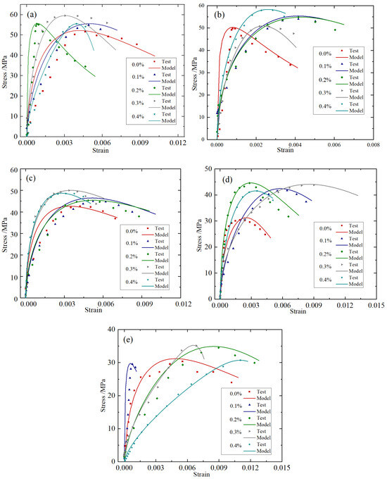 Taking the working condition of an impact speed of 8.8 m/s as an example, based on the test data under different temperatures and different fiber content conditions, the constitutive parameters in Equation (16) were inversely calculated. As shown in Table 4, the comparison of the theoretical values and the experimental values of the stress–strain curve is presented in Figure 10.