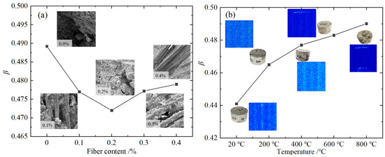Figure 11. β parameter evolution curve: (a) different fiber content; (b) 0.2% BFRC after different temperatures.