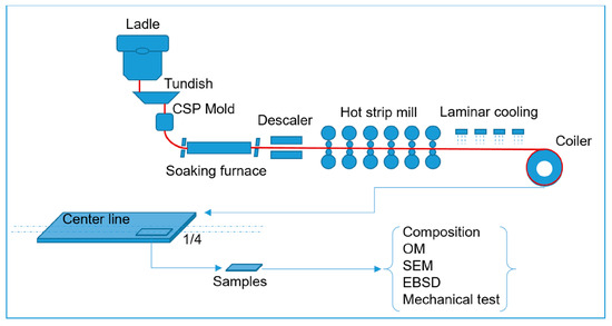 The starting steel sheets were two types of automotive HSLA steels with different strength grades, QSTE340TM and QSTE500TM (taken from Hunan Valin Lianyuan Steel, Loudi, China, and hereafter referred to as Sample A and Sample B, respectively), produced by CSP processes. These steels are hot-rolled pickling sheets widely used in automotive structural components [9,10,11,12]. For Sample A, the finisher entry and delivery temperatures during hot rolling are controlled at 1200 °C and 890 °C, respectively, with a coiling temperature of 620 °C. For Sample B, the finisher entry temperature was set at 1245 °C, while the other temperature parameters remained the same as those for Sample A. The final thicknesses of both steel sheets was 2 mm, and all samples were prepared near the typical 1/4 width position of the sheets. The detailed parameters were shown in Table 1.