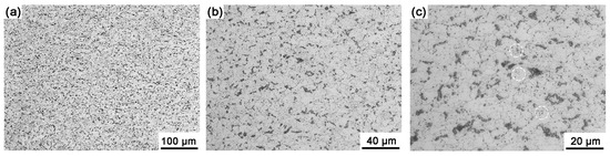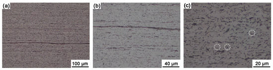 The metallurgical microstructure of Sample B also consists of a ferrite matrix with spheroidized carbides/pearlites (Figure 3). However, pearlite colonies were barely observable, while the carbides exhibited fragmentation and uniform spheroidization, dispersing homogeneously within the matrix. Under the influence of hot rolling deformation, the microstructure developed a pronounced elongated morphology and formed a typical band structure [7]. The spheroidized carbide/pearlite particles (marked in Figure 3c) were dispersed within the grains, and the ferrite grains exhibited an elongated polygonal shape, reflecting the combined effects of dynamic recovery and static recrystallization during cooling.