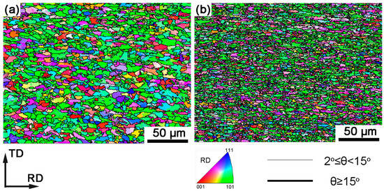 Microstructural observations were conducted using optical microscopy (OM), scanning electron microscopy (SEM), and electron backscatter diffraction (EBSD). The OM used is a Zeiss Axio Vert.A1 (manufactured by ZEISS, Oberkochen, Germany). The SEM employed is a Zeiss GeminiSEM 500 field-emission scanning electron microscope (FE-SEM, manufactured by ZEISS, Oberkochen, Germany). EBSD analysis was conducted using an Oxford AZtec EBSD system (Symmetry version) equipped on the SEM. For OM and SEM, samples were ground from 320 to 2000 grit, mechanically polished, and then etched for approximately 30 s in a solution of nitric acid and ethyl alcohol (4:96 by volume). EBSD samples were ground with 2000-grit abrasive paper and then electropolished in a mixture of perchloric acid and ethyl alcohol (1:9 by volume) at −20 °C under a voltage of 20 V for 1 min. Microstructural analysis was performed on the rolling plane, encompassing both the rolling direction (RD) and transverse direction (TD).