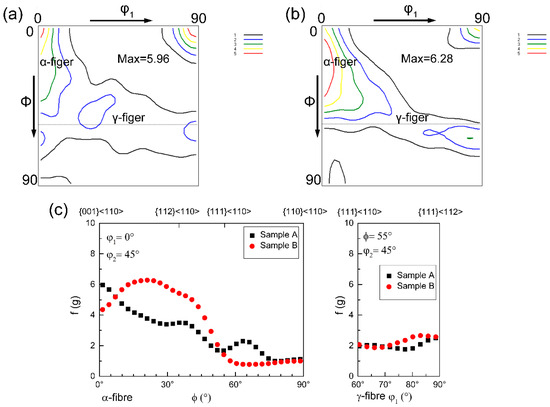 Orientation distribution functions (φ2 = 45° sections) revealing texture evolution for the two experimental steels: (a) Sample A, (b) Sample B, and (c) orientation intensity along the α-fiber and γ-fiber.