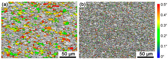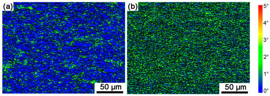 Kernel average misorientation (KAM) maps display the distribution of local crystallographic misorientations, calculated as the mean orientation difference between a reference point and its neighbors. It can be applied to compute dislocation density [41,42]. In Figure 9, the kernel average misorientation is calculated using a 5 × 5 kernel with an upper threshold taken as 5° [34]. KAM values exhibit significant regional heterogeneity, with elevated regions corresponding to dislocation accumulation zones. The average kernel average misorientation values (KAMave) were calculated using [43]: