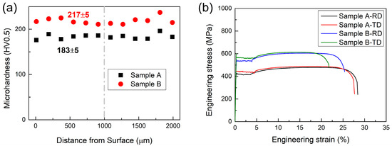 where σ0 is the friction stress, taken to be 50 MPa for bcc Fe [30]. Since there is a strong correlation between microstructure and mechanical properties, it is essential to systematically test mechanical properties and analyze the influence of microstructure on these properties. Figure 10a illustrates the microhardness distribution along the thickness direction for both steels, revealing good uniformity in the two steels with no significant differences in hardness between the surface and center regions. The tensile curves in Figure 10b demonstrate that Sample B exhibits significantly higher tensile stress (Rm) and yield stress (Rp0.2) compared to Sample A. Furthermore, the minimal variation in mechanical properties between the RD and TD indicates that the current texture composition (dominated by α-fiber and γ-fiber textures with minor θ-fiber texture) does not induce significant mechanical anisotropy. Detailed mechanical property parameters of the experimental steels are summarized in Table 4.