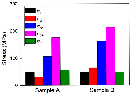 where Ki represents the strengthening coefficient for each solute element and Ci represents the concentration of the elements [47]. The results are 30.5 MPa and 63.8 MPa for Sample A and Sample B, respectively.