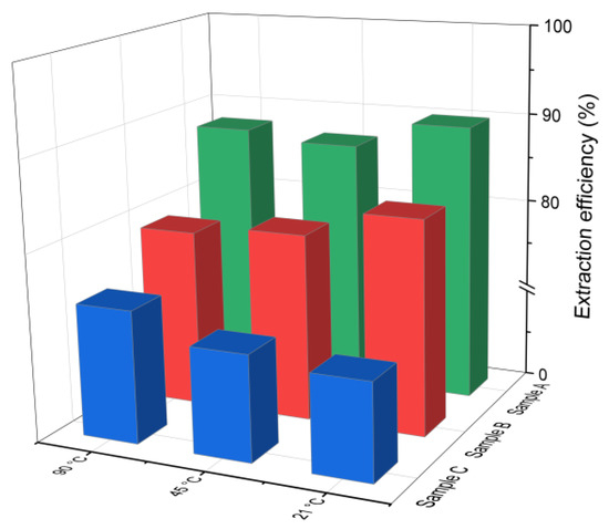 Chloride ion leaching efficiency for samples A, B and C with water as a function of the reaction temperature (using Equation (1)).