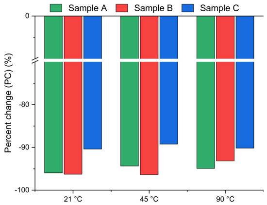 Figure 4 presents the effect of leaching temperature on the change in selected metal oxide concentrations in samples A, B, and C. The results are expressed as percent change (PC), representing the relative difference in metal oxide content in the solid residue after the leaching process (calculated using Equation (2)).