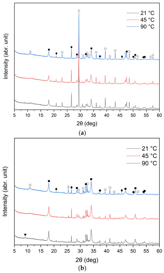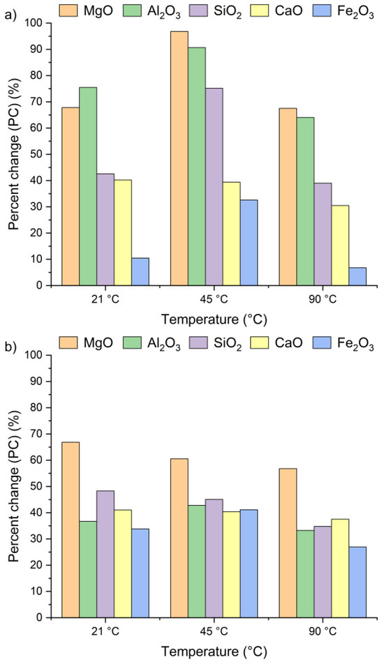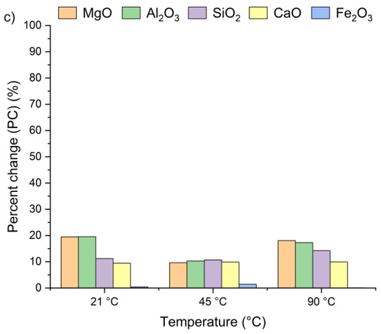 The positive percent change values for all the samples indicate an increase in metal oxide concentrations in the solid residues compared to the original raw material. In the case of samples A and B, no clear linear relationship was observed between the temperature and the concentrations of Al2O3, SiO2, MgO, and Fe2O3 in solid residues. As depicted in Figure 4a,b, the concentrations of SiO2, Al2O3, and Fe2O3 initially increased from 21 °C to 45 °C and then decreased as the temperature rose to 90 °C. An exception was observed for CaO, whose concentration in samples A and B slightly decreased, by ~1–3%, together with increasing temperature. This suggests that the highest CaO content in the solid residue can be obtained at 21 °C. The decrease in metal oxide concentrations at the highest temperature may be related not only to changes in solubility equilibria but also to the stability of secondary phases under leaching conditions. Although the leachates remained strongly alkaline (pH 12–13) across all temperatures, higher temperatures could shift the solubility equilibria of certain metal hydroxides (e.g., Mg(OH)2, Fe(OH)3), promoting their precipitation and retention in the solid phase [42,47,48]. Moreover, the increase in oxide concentration in solid residues may also be attributed to the reprecipitation of metal ions as hydroxides, or their incorporation into newly formed secondary phases such as ettringite or portlandite. These processes are favored by high pH conditions and the presence of abundant calcium ions, which facilitate the immobilization of Al3+, Mg3+ or Fe3+. Among all the analyzed oxides, MgO reached the highest PC, while Fe2O3 exhibited the lowest. In sample A, the percent change in MgO ranged from 67% to 97% and in sample B from 51% to 67%, depending on temperature. This indicates a nearly twofold increase in MgO concentration in the solid residue. Interestingly, the concentrations of metal oxides in sample C remained largely unaffected by temperature variations and demonstrated considerably lower percent change values compared to samples A and B. This behavior may be linked to the lower chloride content in sample C (see Table 1). The apparent increase in Ca, Al, Si, Mg, and Fe oxides observed in samples A and B after chloride removal is primarily a relative effect caused by the dissolution of highly soluble salts, such as KCl, NaCl, and partially sulfates. This selective leaching reduces the overall solid mass while leaving the main silicate and aluminate phases largely unaffected, which results in an apparent enrichment of these oxides in the residue. Such concentration effects are typical in alkaline leaching systems. The pH of wet CBPD is strongly basic (12–14) [49], due to the presence of alkali compounds that dissociate and release hydroxide ions (OH−). In this environment, the dominant oxides remain stable and largely insoluble [50,51]. In contrast, sample C exhibited only minor compositional changes, likely reflecting that its metals were already present in stable, insoluble forms within the raw material.
