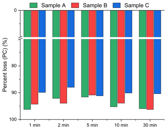 Figure 3 presents the chlorine ion removal efficiency for samples A, B and C calculated using Equation (2), based on the chloride content measured in the solid residue via XRF. A negative value indicates a decrease in chlorine concentration in the solid phase after leaching. Interestingly, the results reveal significantly higher leaching efficiencies (>90%) compared to those presented in Figure 2. The differences between the leaching efficiency values are likely due to the use of different analytical methods: Mohr’s titration for the leachate and XRF for the solid residue. While Mohr’s titration is a sensitive method for determining soluble chlorides, the precision of endpoint detection can be affected by operator subjectivity, coexisting ions, or incomplete precipitation of AgCl, potentially leading to an underestimation of chloride ion concentrations in the solution [39]. The endpoint is determined by visual observation of the color change from yellow to red-brown. The difference that exists between the observed endpoint and the actual chemical equivalence in titration may lead to slight errors in the results [40]. In contrast, XRF quantifies the total elemental composition of the solid residues, including bound or less soluble chlorine forms, and therefore may yield systematically different values. The observed discrepancies highlight the complementary nature of these two techniques: titration provides direct information about the soluble fraction of chlorides, whereas XRF captures the total chlorine content in the solid phase. Taken together, the results consistently confirm that chlorine was effectively removed under the applied conditions.