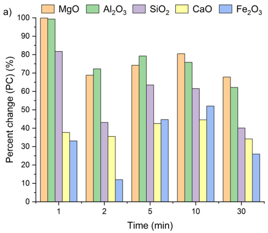 Figure 7 presents the changes in oxide concentrations in samples A, B and C after leaching for 1, 2, 5, 10, and 30 min, expressed as a percent change. Positive PC values indicate an increase in selected oxide content in the solid residues of all the tested samples, regardless of leaching time. Interestingly, a visible increase in oxide concentrations was already observed after the first minute. It can be clearly witnessed that extending the leaching time had only a minor effect on the calcium concentration. After 30 min of leaching, the CaO content in the solid residues was only 13% higher compared to the values recorded after 1 min. The highest calcium content relative to the initial concentration (Table 1) was detected within a 5–10 min interval. These findings are in line with results previously reported by Lee et al. [35] and Seo et al. [31].