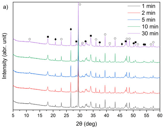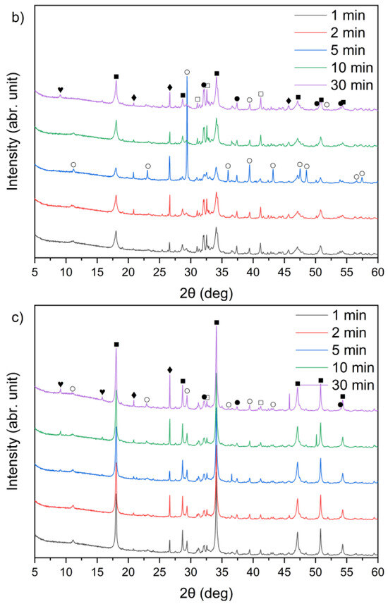 By comparing Figure 1 and Figure 9a–c, it can be observed that the characteristic peaks of sylvite disappeared in samples A, B, and C within the first minute of the leaching process, confirming the rapid dissolution of chloride salts. In addition, the intense peaks originally present in the raw bypass dust at diffraction angles of approximately 32–33°, 37–38° and 54–55° (2θ), corresponding to lime (CaO), showed a substantial decrease after just 1 min of contact with water. Concurrently, a new diffraction peak emerged, indicating the formation of portlandite (Ca(OH)2) as a result of CaO hydration.