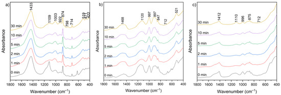 FT-IR spectra of solid leaching residues for (a) sample A, (b) sample B, and (c) sample C at different times.