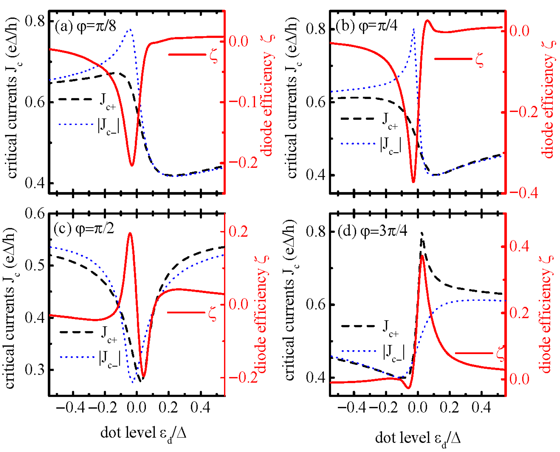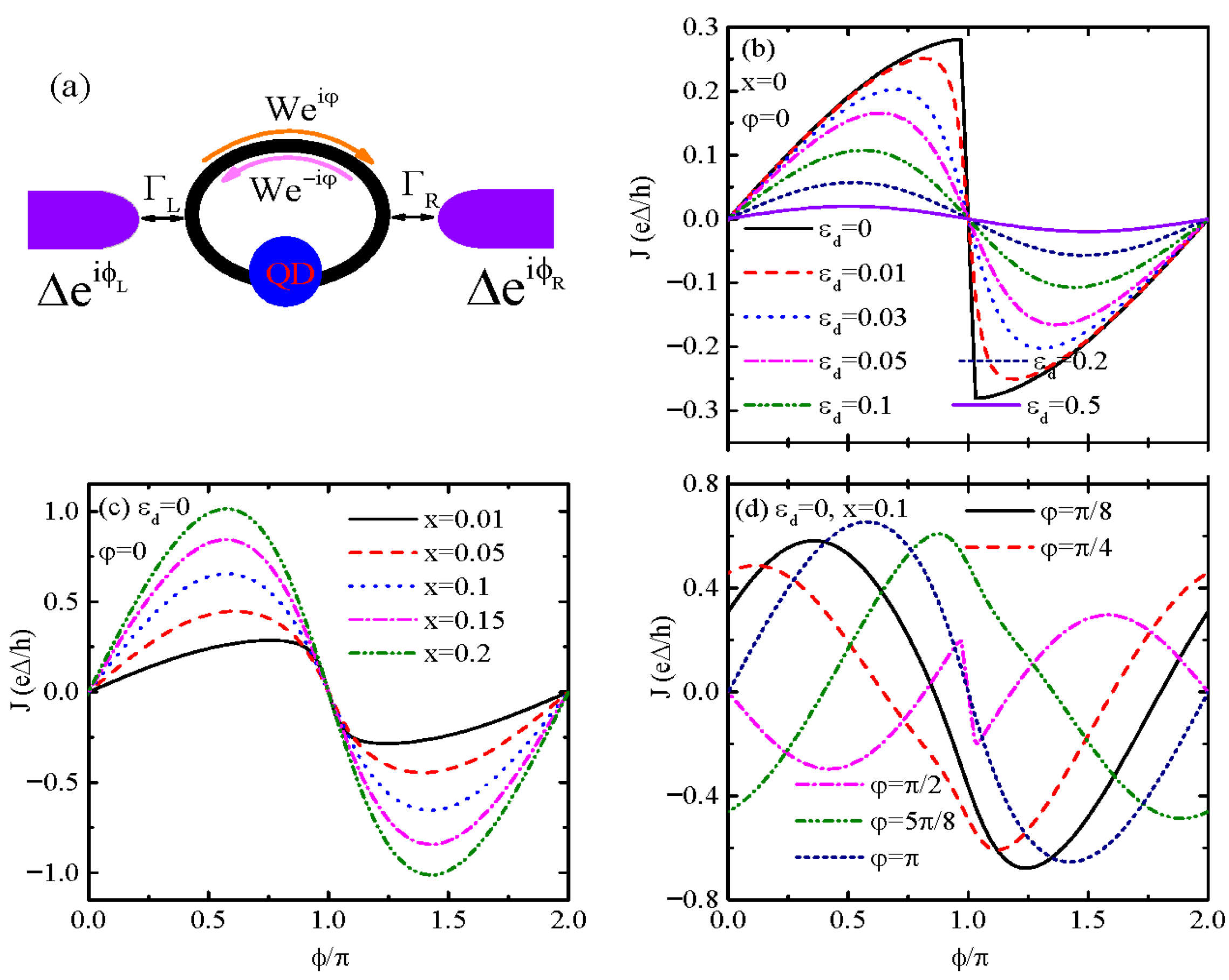 Figure 1a. It consists of an AB interferometer sandwiched between two superconductor leads. The supercurrent driven by the two superconductors’ phase difference becomes nonreciprocal due to a magnetic flux penetrating through the ring and by properly changing the QD’s energy level. As compared to previous similar setups [