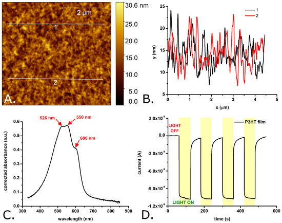 AFM image of a P3HT film spin coated onto a glass substrate (A), profiles extracted from the AFM image showing the rugosity of the film (B), absorption spectrum of P3HT-coated glass (C), and photocurrents obtained with glassy carbon electrodes modified with a P3HT film (D). Observations: The glassy carbon electrode modified with the P3HT film was periodically illuminated with a white light LED placed 2 cm from the modified electrode surface. The LPD at the P3HT film was 1.3 mW/cm2.