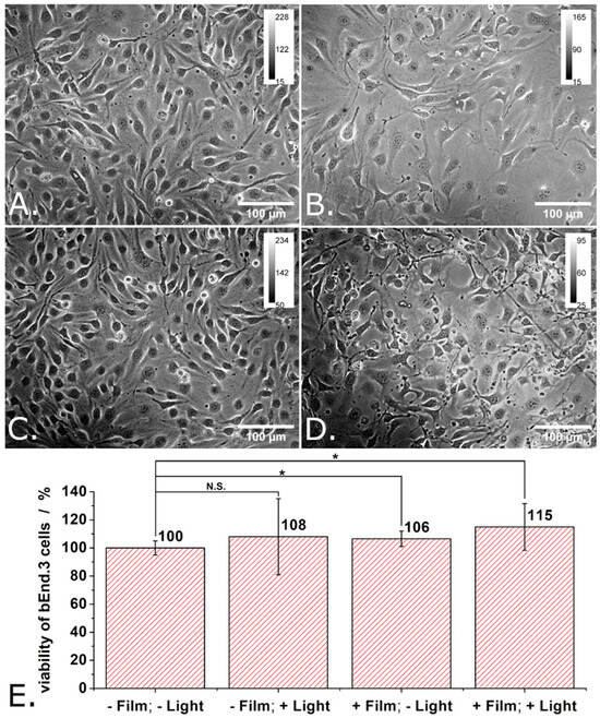 Transmitted light microscopy images of “reference” bEND cells (A), of bEND cells grown onto P3HT-coated glass (B), of reference bEND cells subjected to light pulses (C), and of bEND cells grown onto P3HT-coated glass and subjected to light pulses (D), and the viability of such cells (E). Experimental conditions: Cells were grown onto either glass slides or P3HT-coated glass slides for 48 h. After 48 h, the culture medium was renewed and the cells were further cultivated for another 24 h. For the illumination protocol, three trains of light pulses (at LPD = 1.3 mW/cm2) distributed over 24 h were applied. Each train contains 900 pulses of 1 s duration and 0.5 Hz repetition rate. After 24 h the MTT assay was performed. Asterisks indicate levels of statistical significance: p < 0.05 (*).