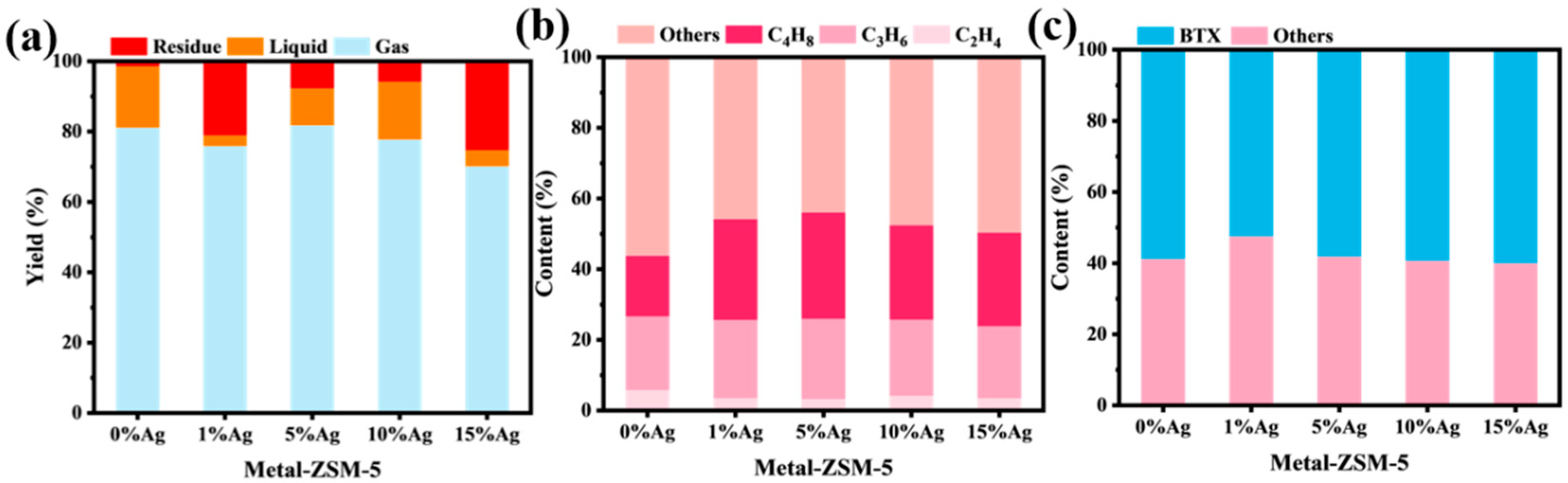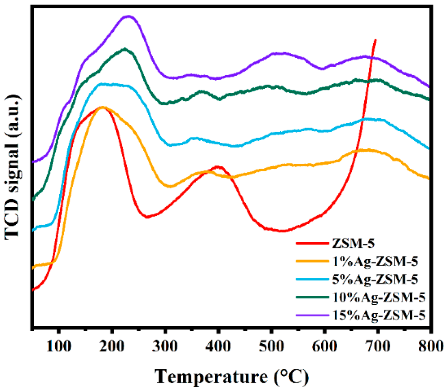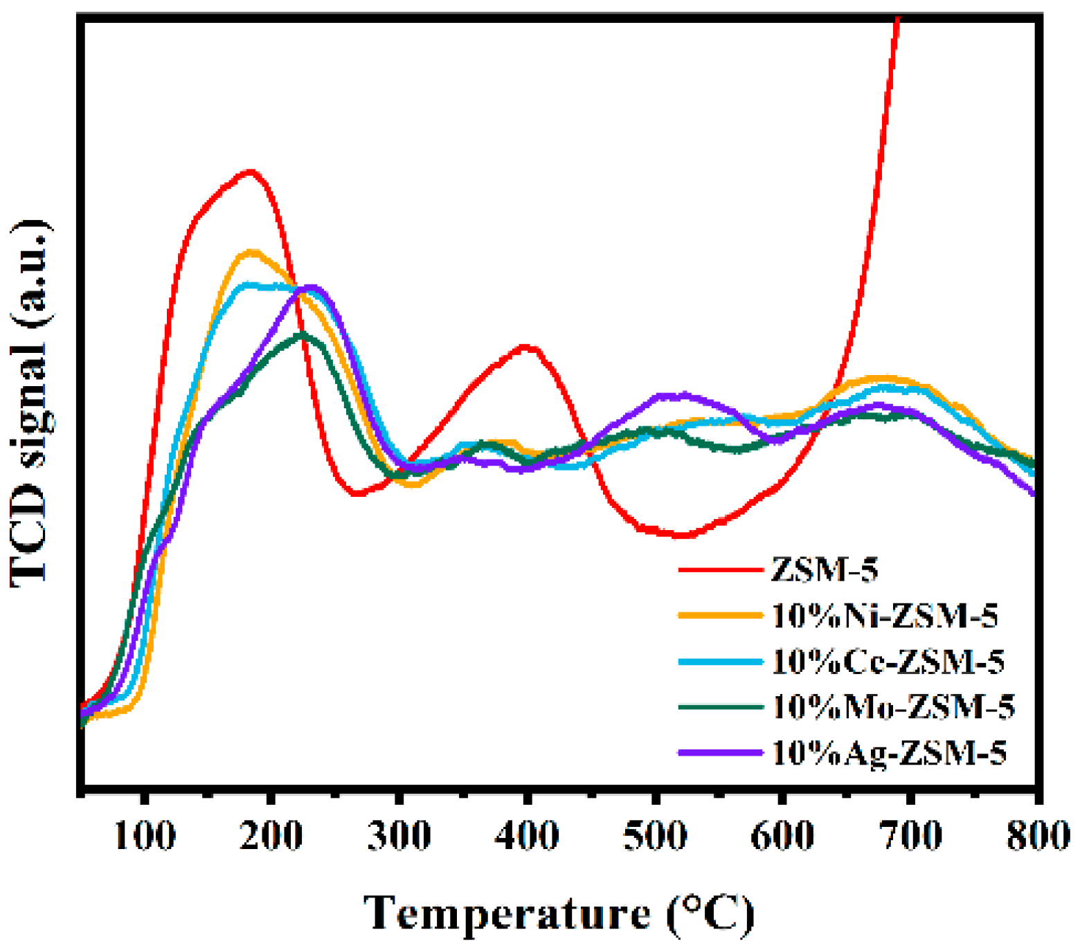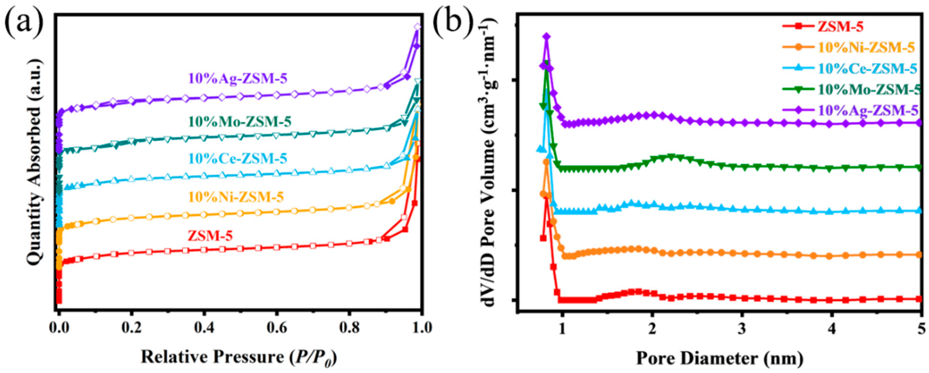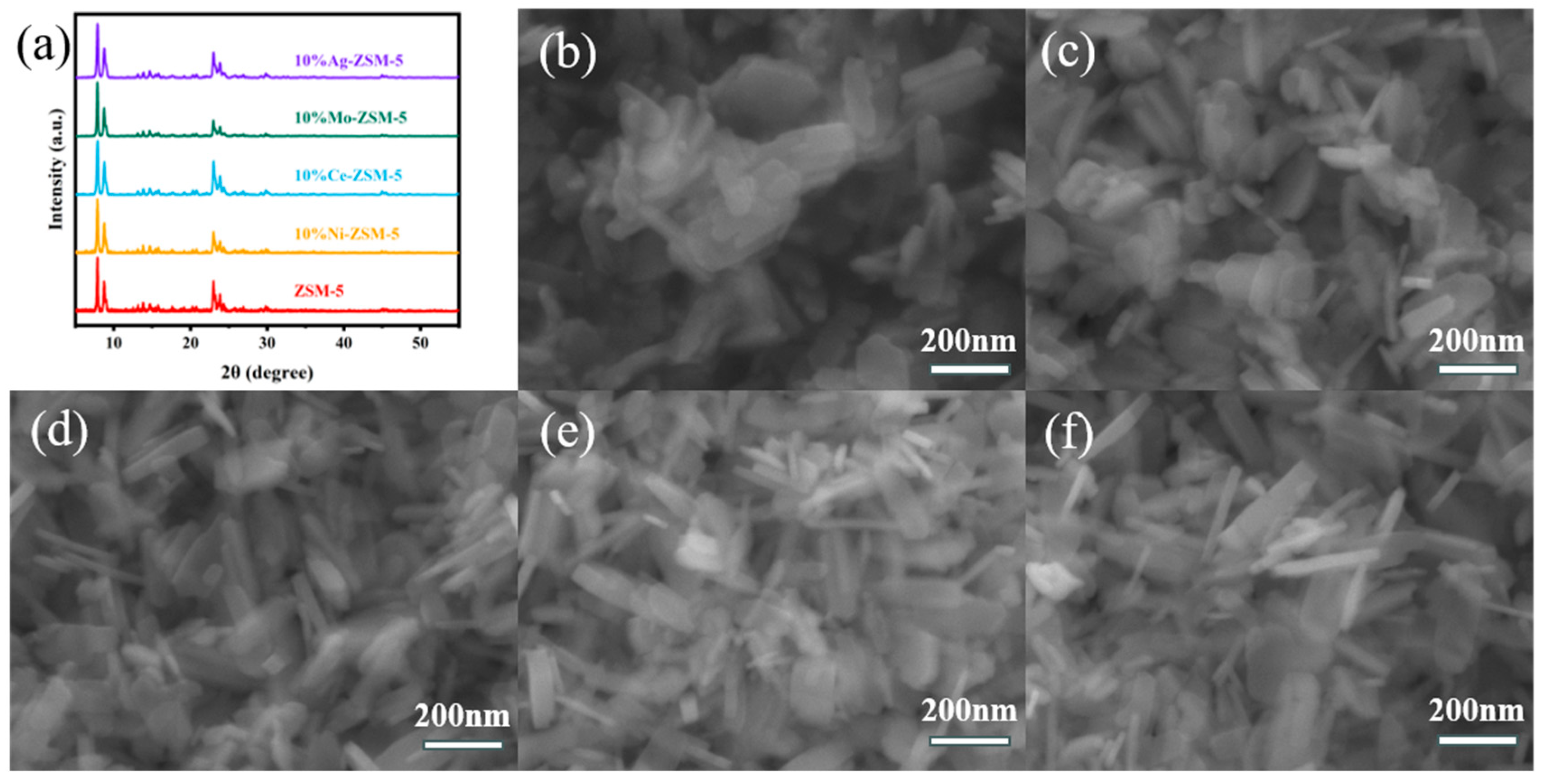 2.1. ZSM-5 Loaded with Different Metal Ions (Ce, Mo, Ni, and Ag)