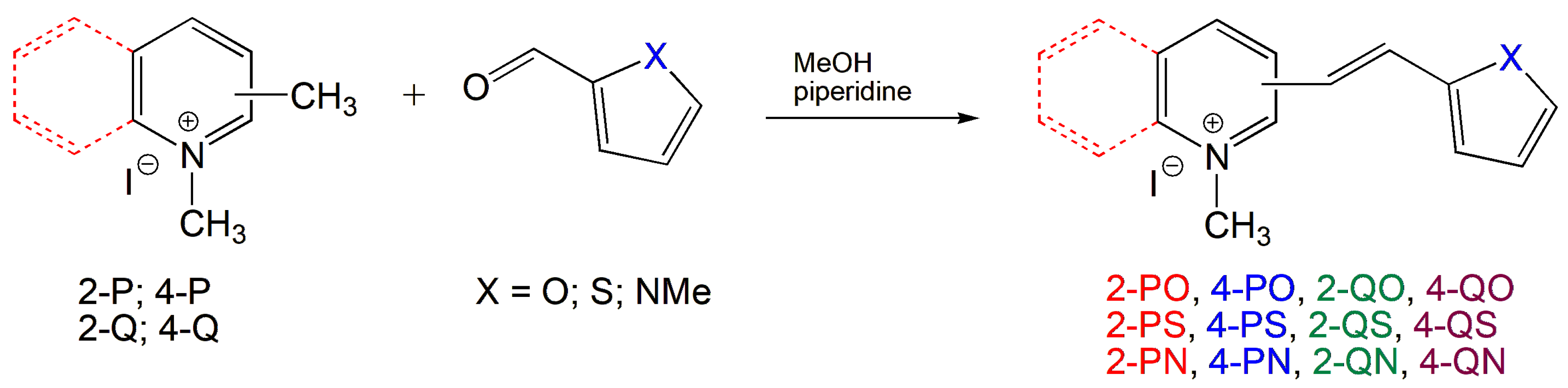 - Koelsch, C.F. The Condensation of α-Picoline Methiodide with Aromatic Aldehydes. J. Am. Chem. Soc. 1944, 66, 2126. [Google Scholar] [CrossRef]