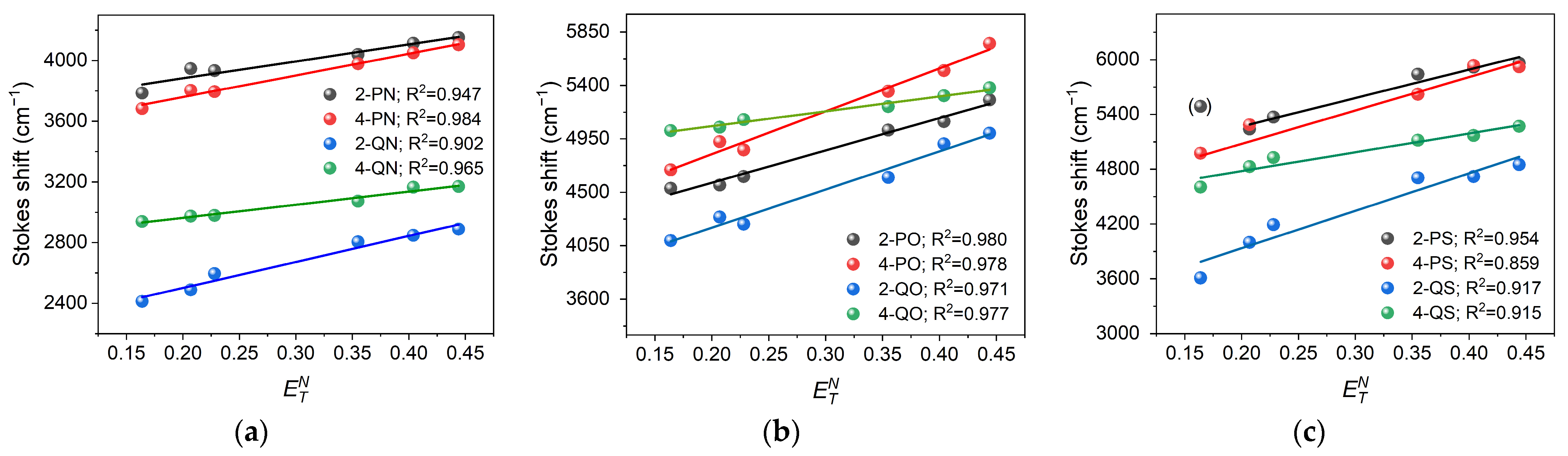 - Zhan, C.-L.; Wang, D.-Y. Nonlinear dependence of solvent polarity effects on twisted intramolecular charge-transfer states and linear relation for electronic spectra in a stilbazolium-like dye. J. Photochem. Photobiol. A Chem. 2002, 147, 93–101. [Google Scholar] [CrossRef]