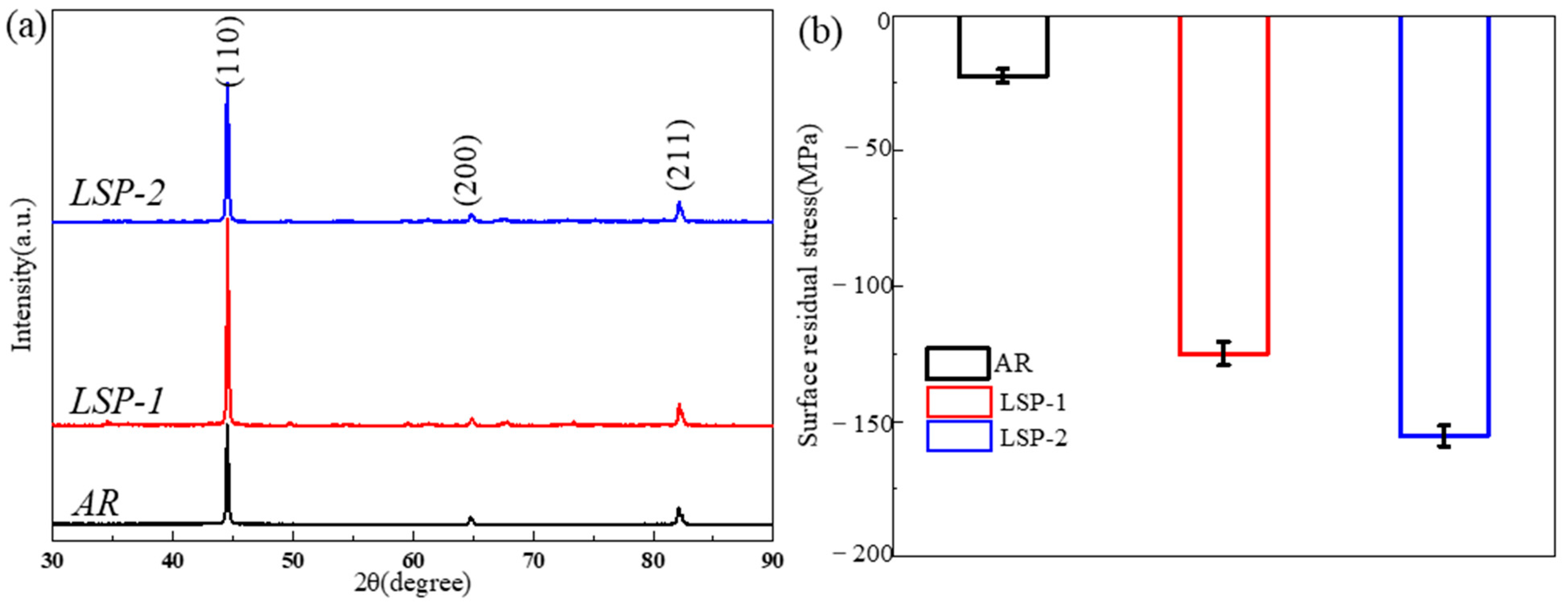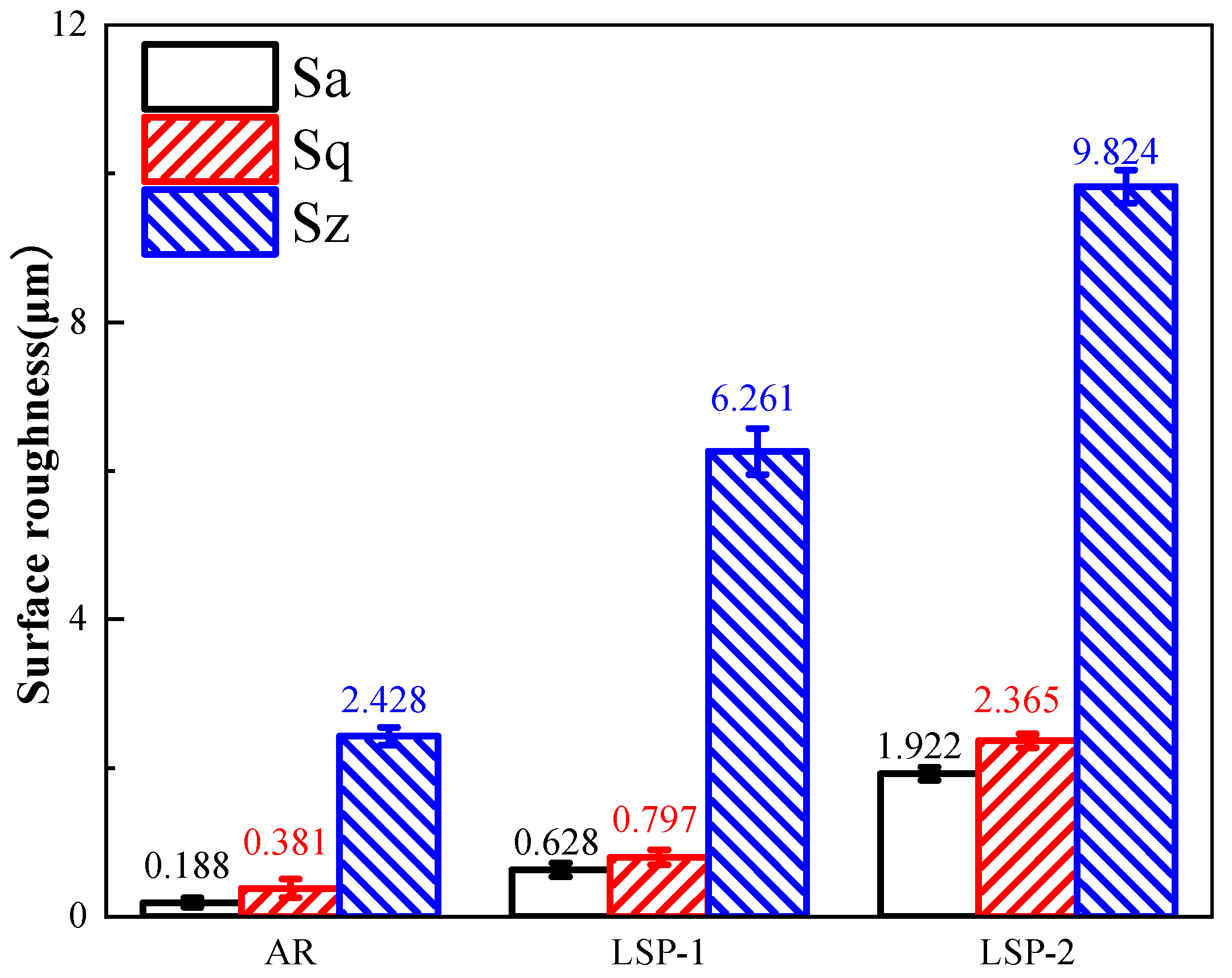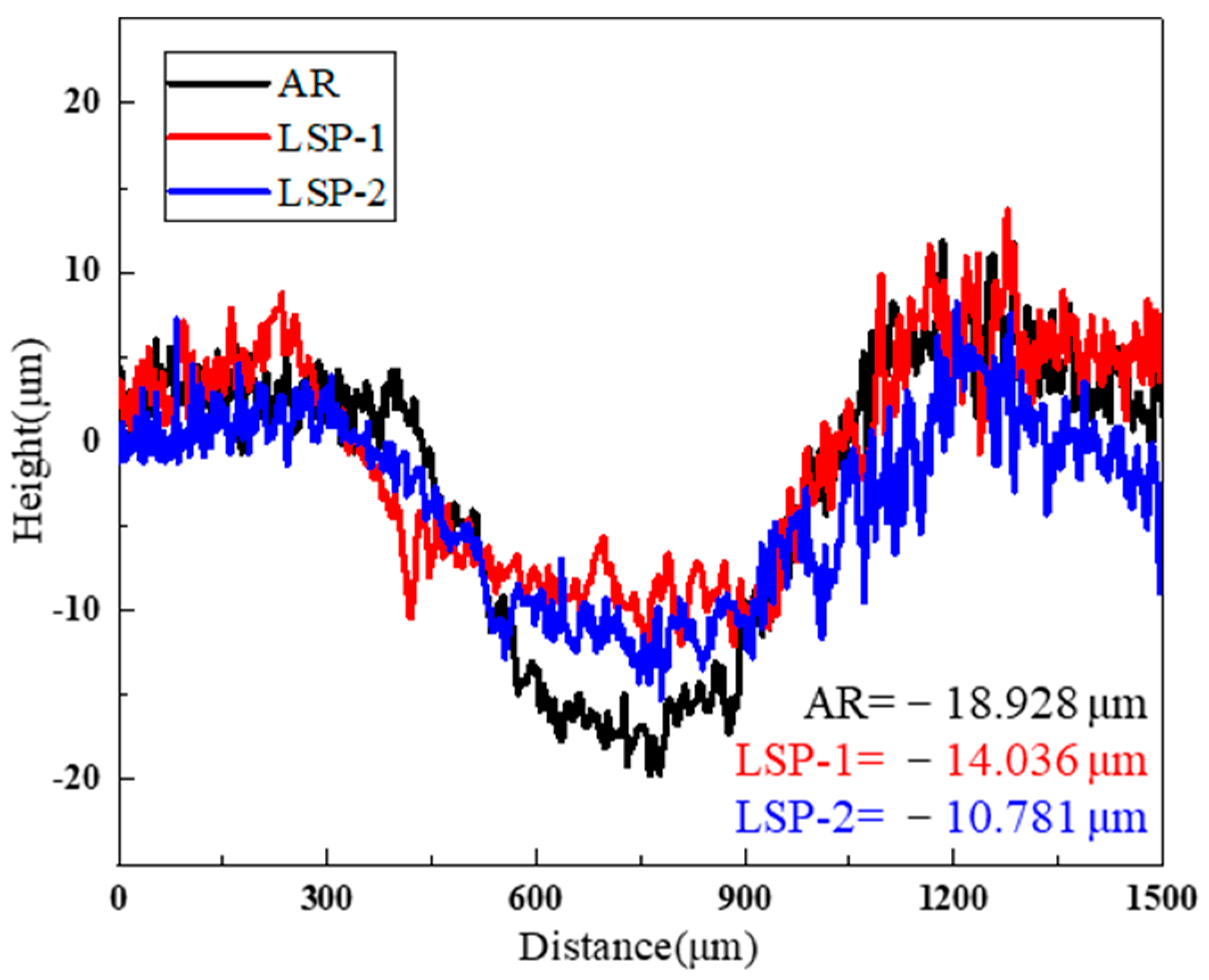 - The plastic deformation induced by LSP increases the surface roughness of AH32, while also inducing high-magnitude residual stress on the surface. The residual stress for the LSP-2 sample reaches −162 MPa.
