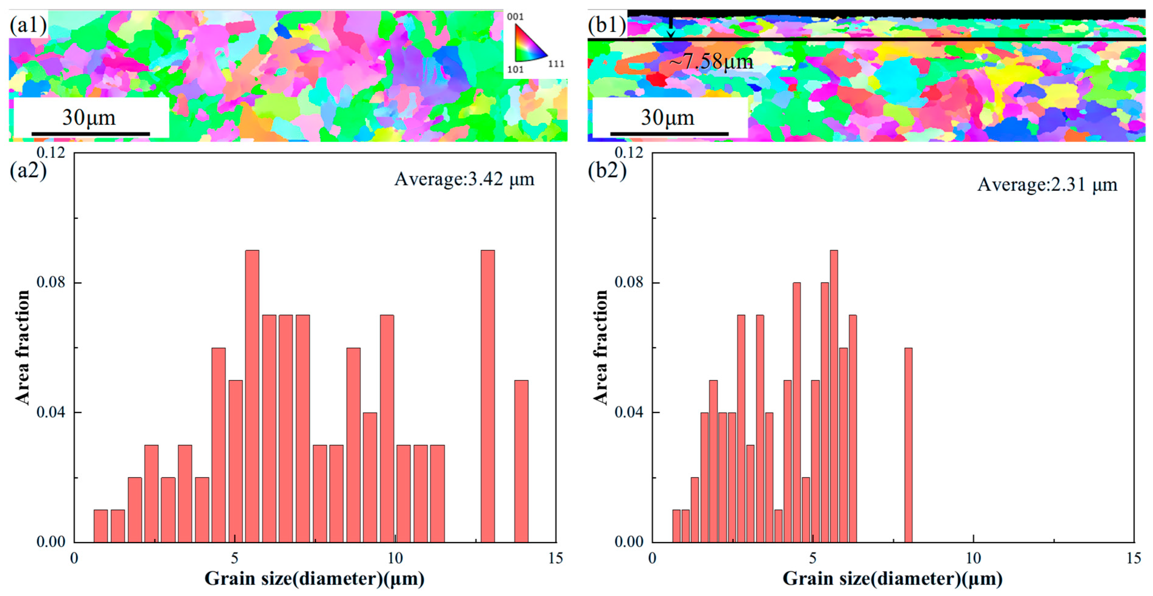 - The typical microstructure of AH32 steel mainly consists of ferrite and carbides. The microstructural evolution after LSP treatment is primarily characterized by a significant reduction in cementite within the grain boundaries, while cementite particles precipitate along the boundaries of the grains. The LSP-2 sample exhibited an affected layer depth of approximately 7.58 μm, which was accompanied by a 32.4% refinement in grain size compared to the AR sample.