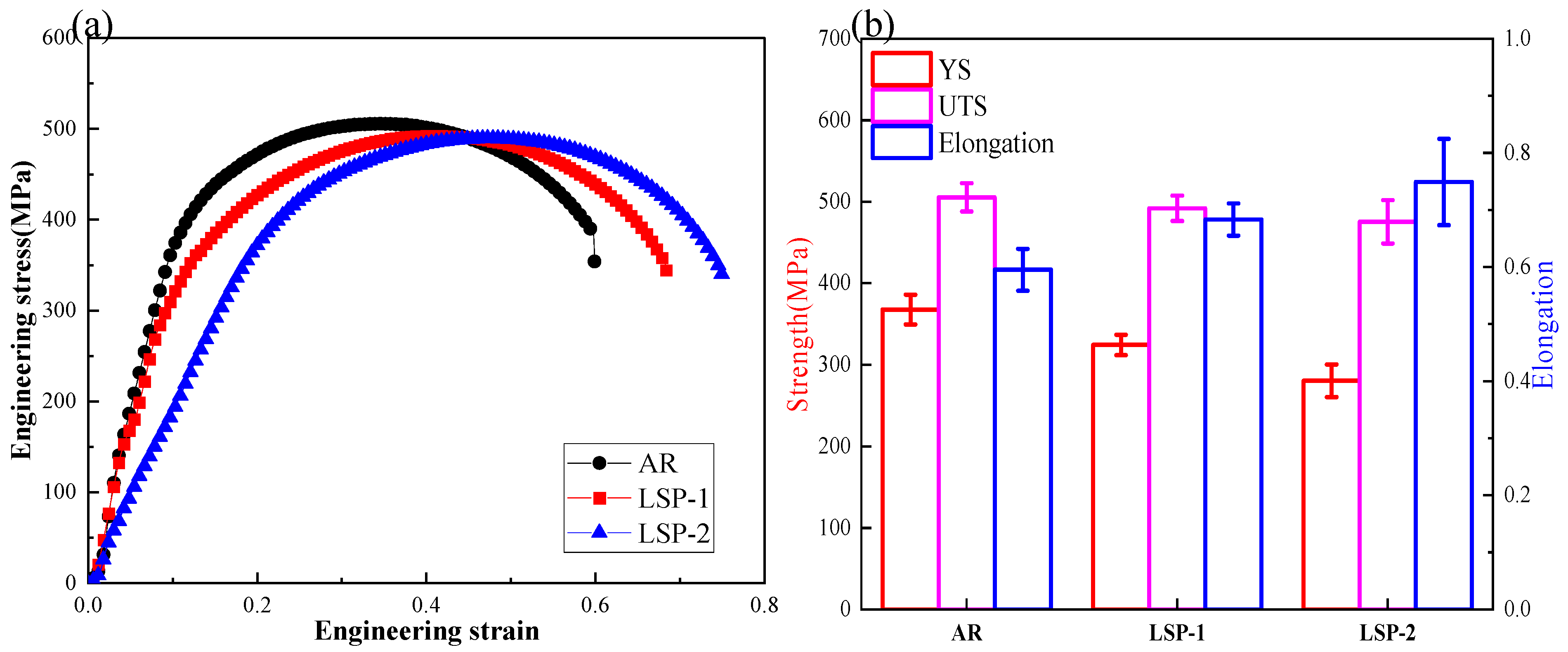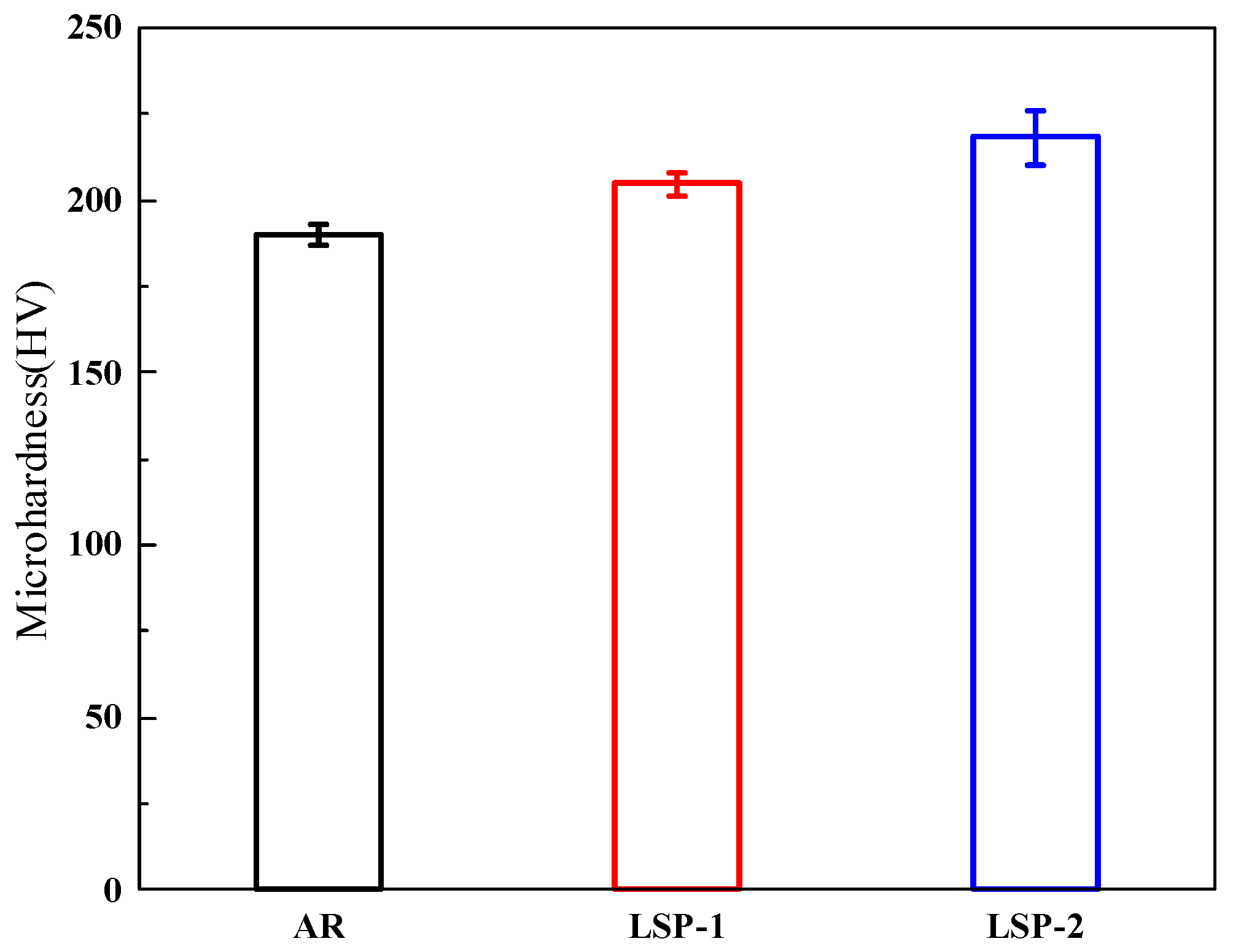 - After LSP treatment, the surface hardness of the samples increased by 7.3% and 14.7%, respectively. The tensile results indicate that LSP-2 exhibits a 25.8% enhancement in elongation while demonstrating only a marginal 5.9% reduction in ultimate tensile strength.
