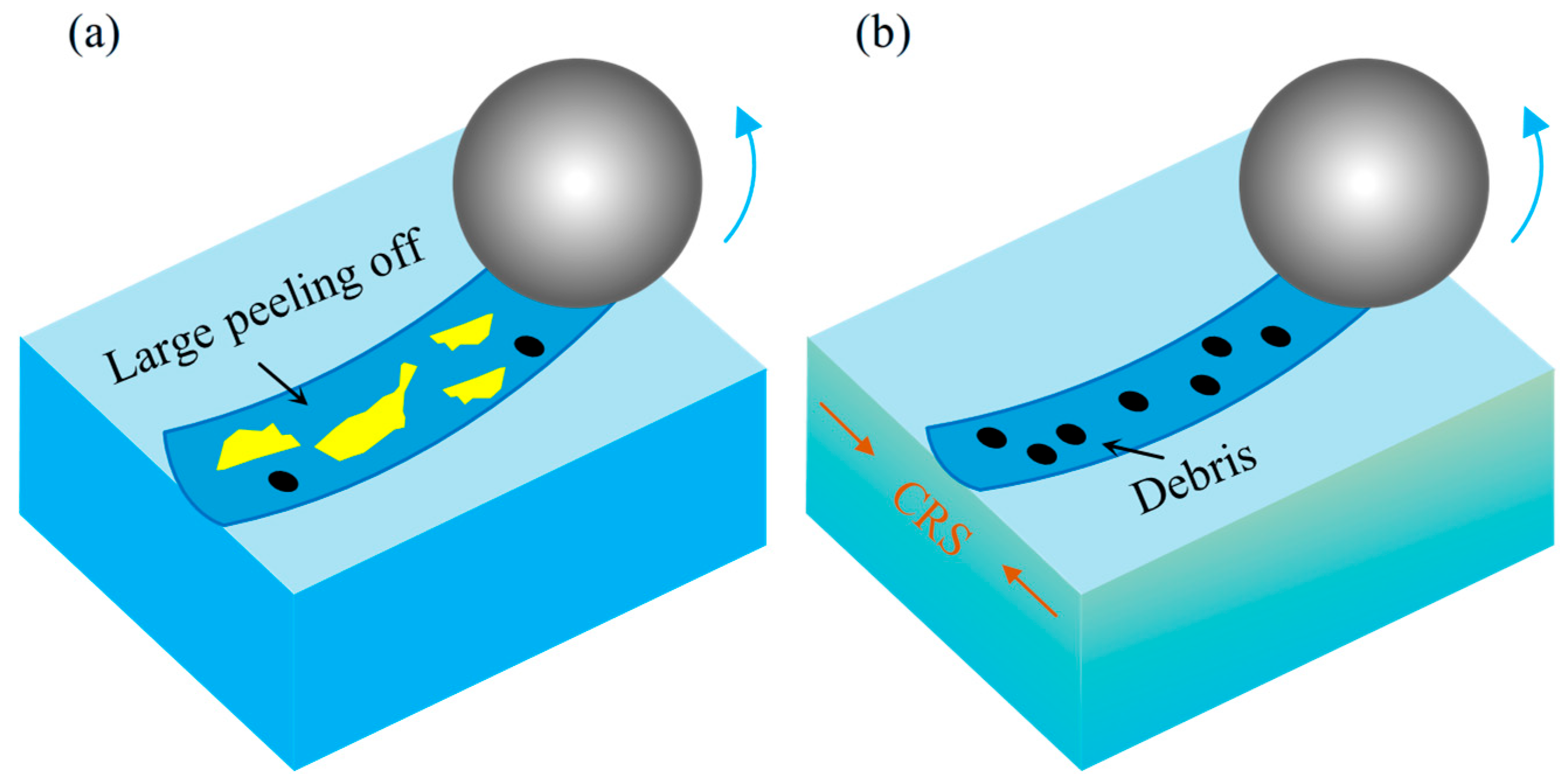 - Cao, Y.; Sun, J.; Ma, F.; Chen, Y.; Cheng, X.; Gao, X.; Xie, K. Effect of the microstructure and residual stress on tribological behavior of induction hardened GCr15 steel. Tribol. Int. 2017, 115, 108–115. [Google Scholar] [CrossRef]