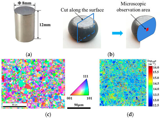 Figure 1. Specimens of hot compression tests. (a) Specimen dimensions; (b) micro-structure observation area; (c) EBSD observation of initial sample; (d) dislocation density of initial sample.
