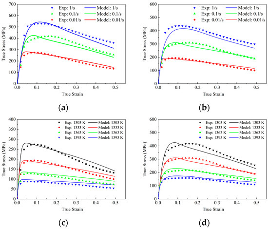 Figure 2. Stress–strain of hot compression tests at various temperatures and strain rates: (a) 1303 K; (b) 1363 K; (c) 0.01 s−1; (d) 0.1 s−1.