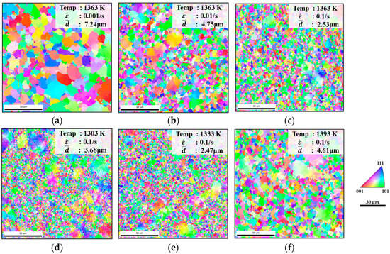 Figure 3. EBSD micro-structure observations at 1363 K; engineering strain is 0.5 under (a) ε ˙ = 0.001 s−1, (b) ε ˙ = 0.01 s−1, and (c) ε ˙ = 0.1 s−1, and when ε ˙ = 0.1 s−1, engineering strain is 0.5 with various temperatures (d) 1303 K, (e) 1333 K, and (f) 1393 K.