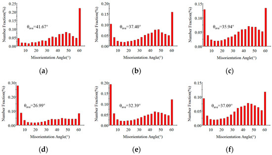 Figure 4. Statistical map of grain boundary orientation difference at 1363 K; engineering strain is 0.5 under (a) ε ˙ = 0.001 s−1, (b) ε ˙ = 0.01 s−1, and (c) ε ˙ = 0.1 s−1. and when ε ˙ = 0.1 s−1, engineering strain is 0.5 with various temperatures (d) 1303 K, (e) 1333 K, and (f) 1393 K.