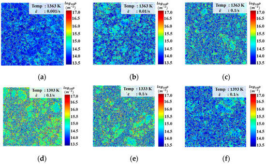 Figure 5. GND density comparison at 1363 K; engineering strain is 0.5 under (a) ε ˙ = 0.001 s−1, (b) ε ˙ = 0.01 s−1, and (c) ε ˙ = 0.1 s−1, and when ε ˙ = 0.1 s−1, engineering strain is 0.5 with various temperatures (d) 1303 K, (e) 1333 K, and (f) 1393 K.