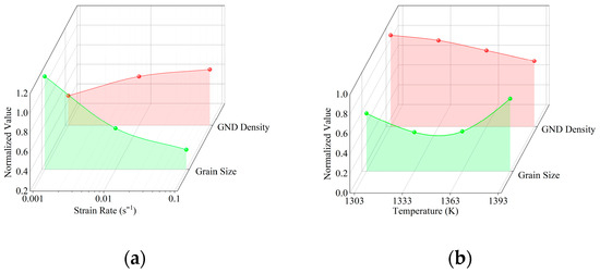 Figure 6. Effect under (a) temperature at 1363 K, (b) ε ˙ = 0.1 s−1 on grain size and GND density.