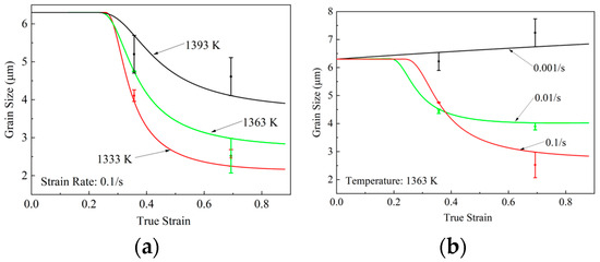 Figure 9. Comparison of experimental and predicted grain size (a) with various temperatures at 0.1 s−1; (b) with various strain rates at 1363 K.