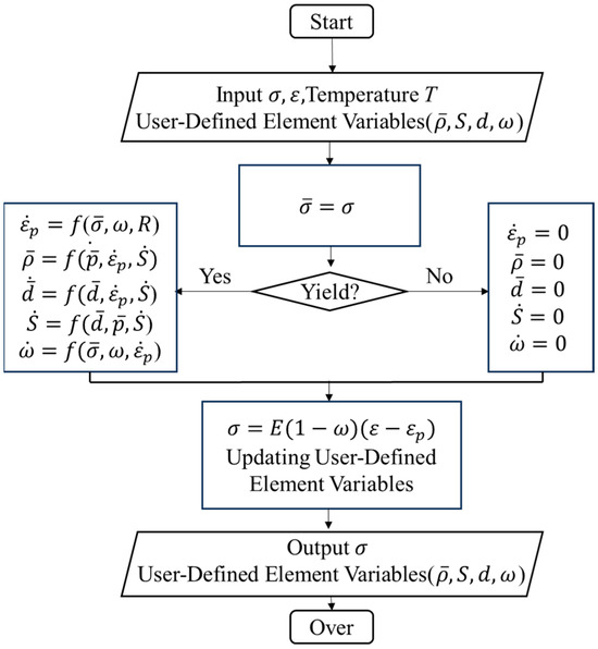 A FE model of the hot compression process was developed using DEFORM-3D V6.1-software. The physically based constitutive model of FGH99 was embedded through user-defined subroutines. Before embedding the model as a user subroutine in DEFORM software, relevant user-defined element variables must be defined for the viscoplastic constitutive model. This facilitates observing the distribution of corresponding macroscopic mechanical properties and microstructural variables in the post-processing module. Table 6 lists the meanings of user-defined variables. The flowchart for incorporating the viscoplastic constitutive model into a subroutine is shown in Figure 10.