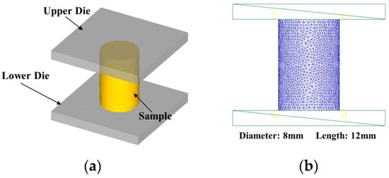 Figure 11. FE model of the hot compression process: (a) 3D model; (b) meshing configuration of the specimen.