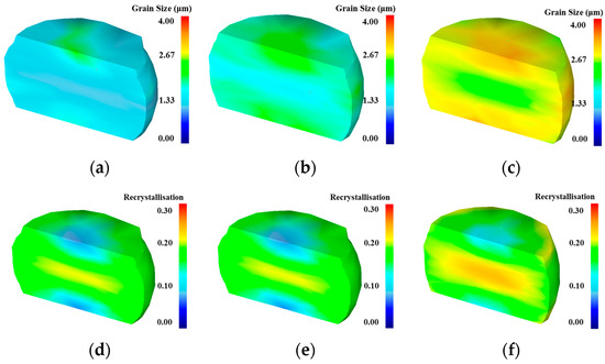 Figure 12. Simulated results when ε ˙ = 0.1 s−1: grain size at (a) 1333 K; (b) 1363 K; (c) 1393 K; DRX fraction at (d) 1333 K; (e) 1363 K; (f) 1393 K.