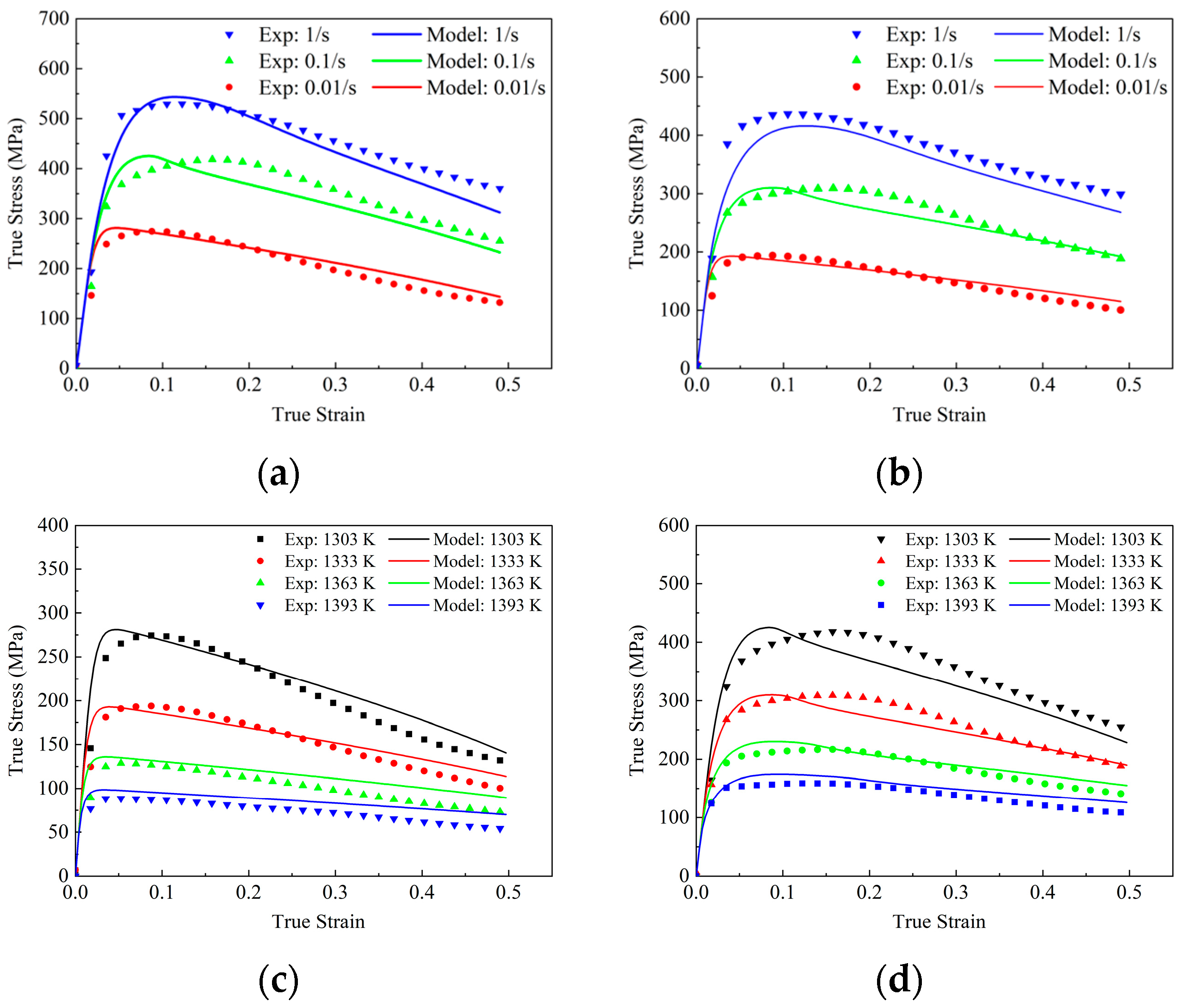 - Lin, Y.C.; Wen, D.X.; Deng, J.; Liu, G.; Chen, J. Constitutive Models for High-Temperature Flow Behaviors of a Ni-Based Superalloy. Mater. Des. 2014, 59, 115–123. [Google Scholar] [CrossRef]