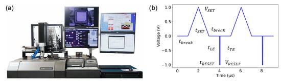 (a) aixMATRIX tester, reproduced with permission from [19]. (b) Waveform employed for characterization, consisting of two identical SET sweeps and two RESET pulses separated by a break interval. Device resistance is determined during the SET sweeps. Figure reproduced with permission from [19].